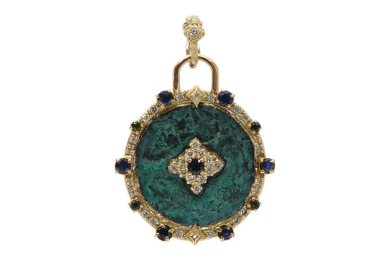 18k yellow gold artifact coin in teal patina with pointed halo in white diamonds. Enhancer Size 0