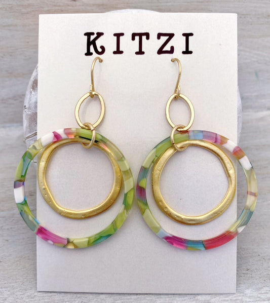 Limited Stock Please Call StoreKitzi Acrylic Pastel Confetti & Gold Double Open Circle Hook Earrings