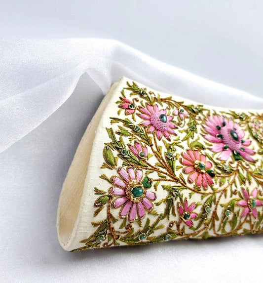 Emerald Gemstone + Silk Hand Embroidered Clutch | Gold Silk with Multicolor Embroidered Emerald Florals