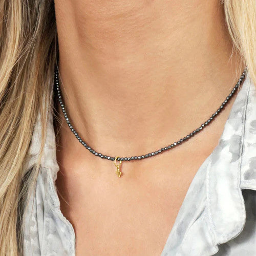 Choker Gemstone 2mm Faceted Hematite Signature Cross Small Gold Charm 15 in