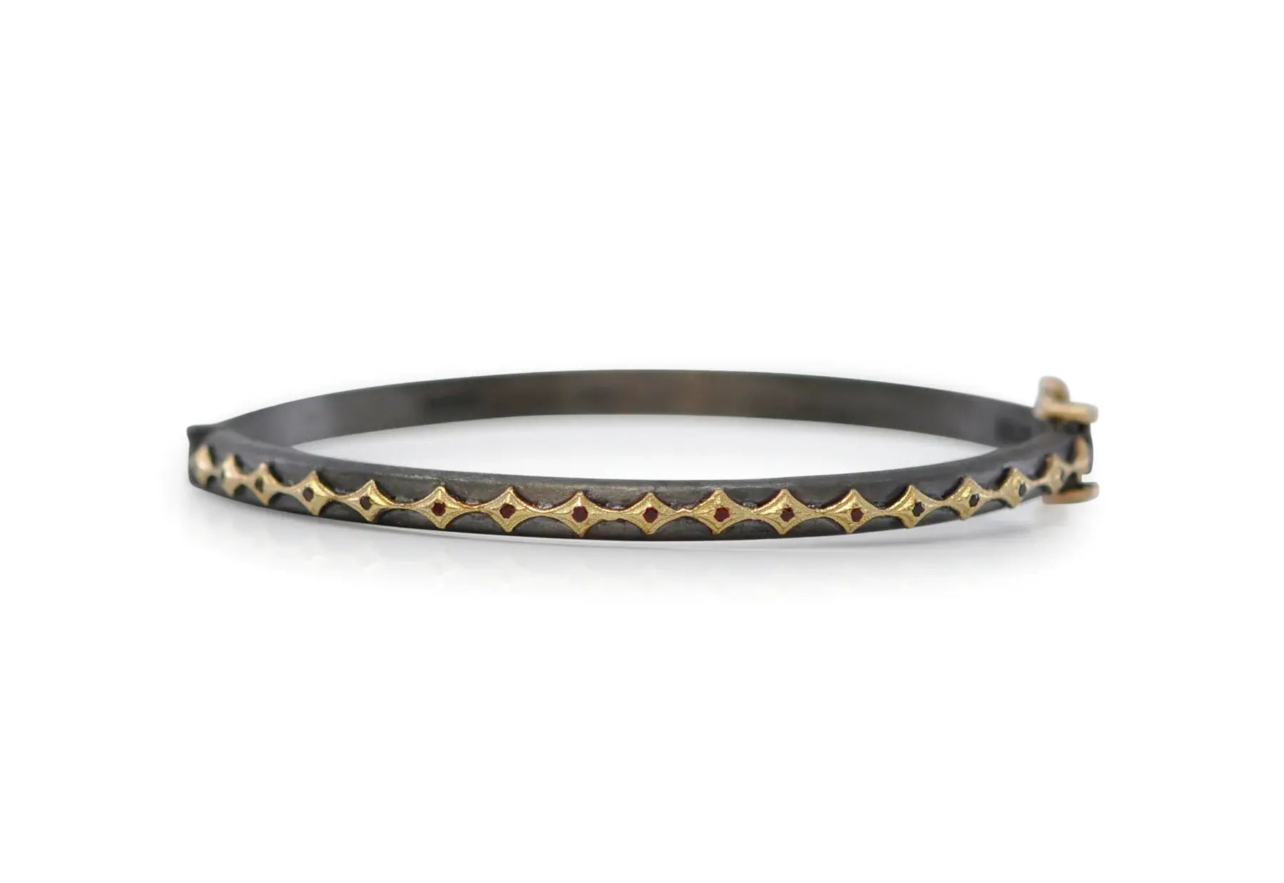 18k yellow gold and BLACKENED sterling silver eternity crivelli huggie bracelet with red garnets. BRACELET Size 57