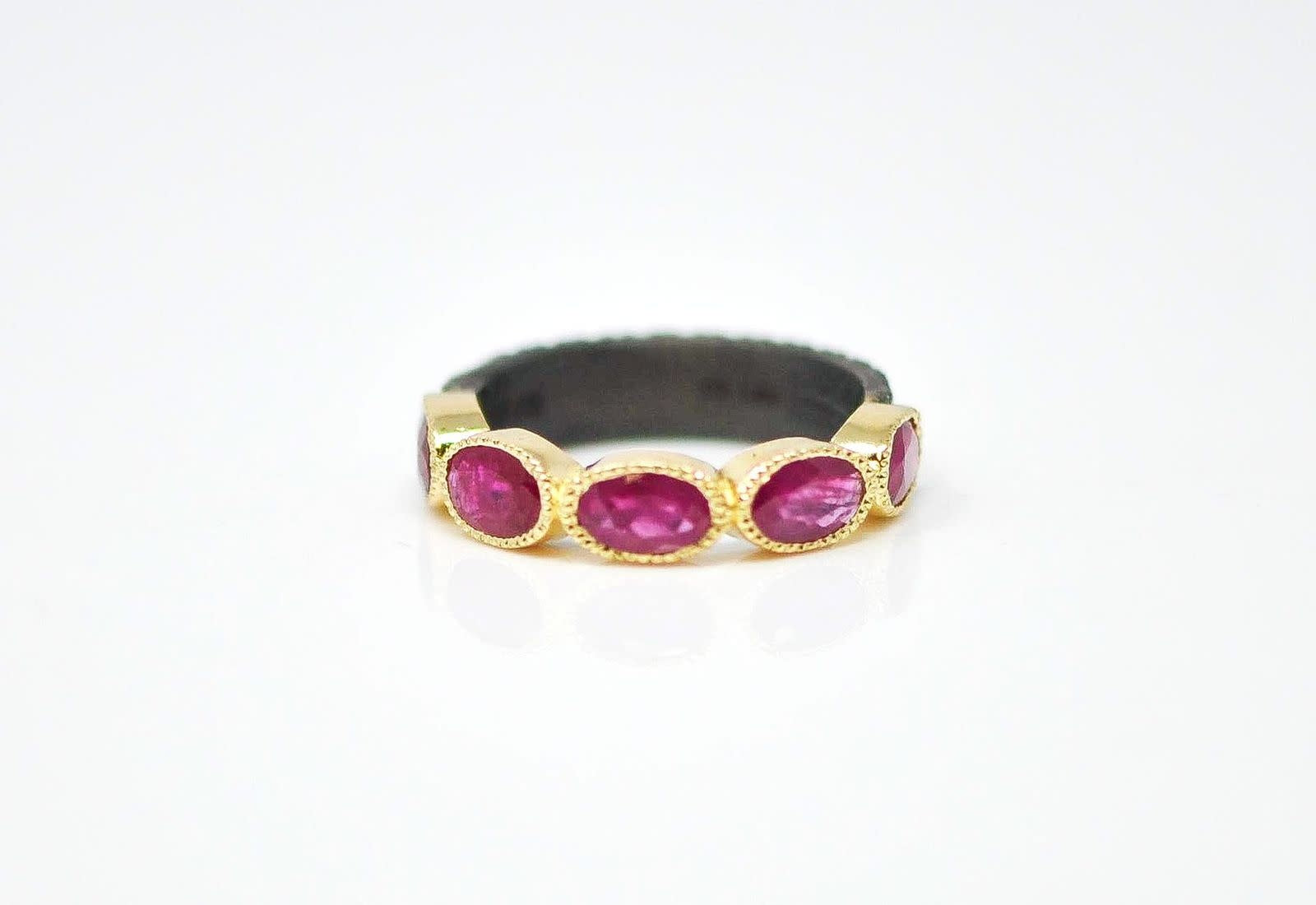 18K Yellow Gold and Grey Sterling silver ring with oval rubies on contoured shank. RING Size 7