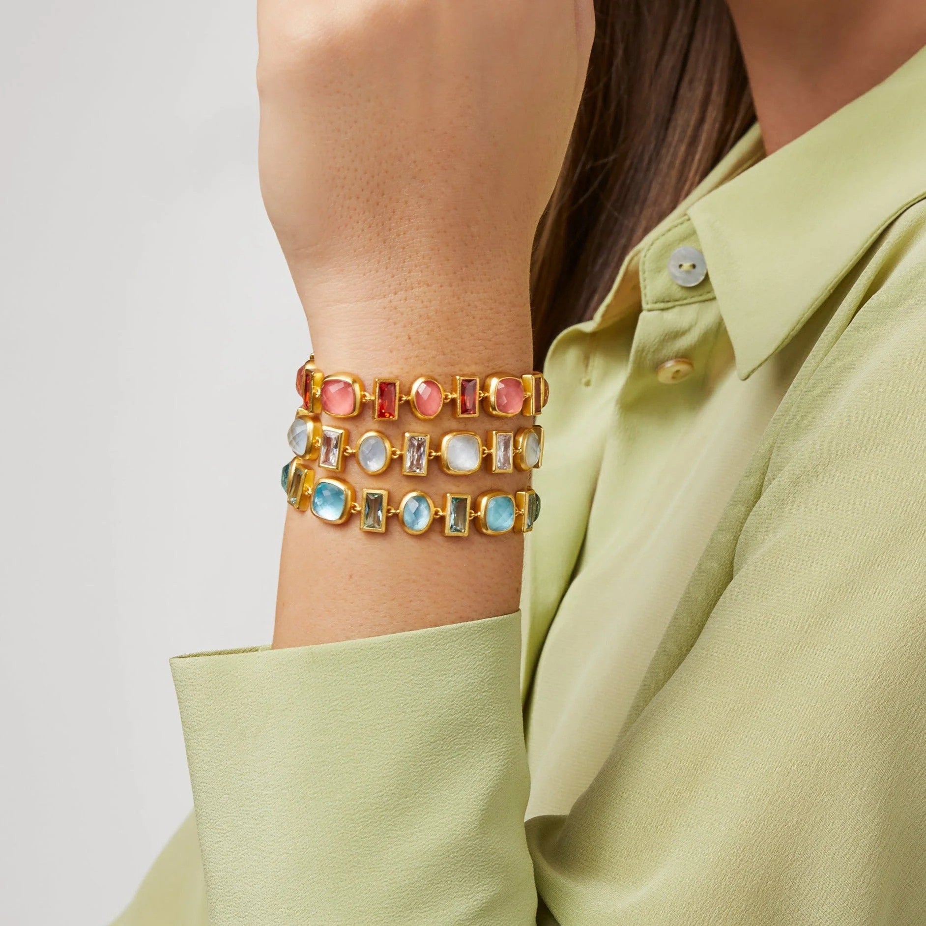 - Model is wearing stack of 3 in Iridescent Coral, Iridescent Clear Crystal, and Iridescent Bahamian Blue (from top to bottom)