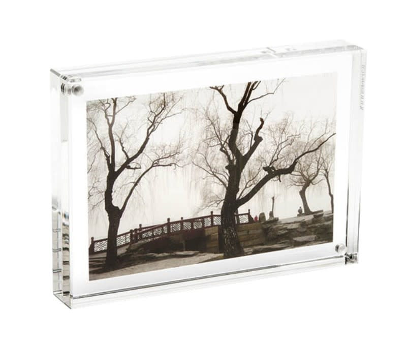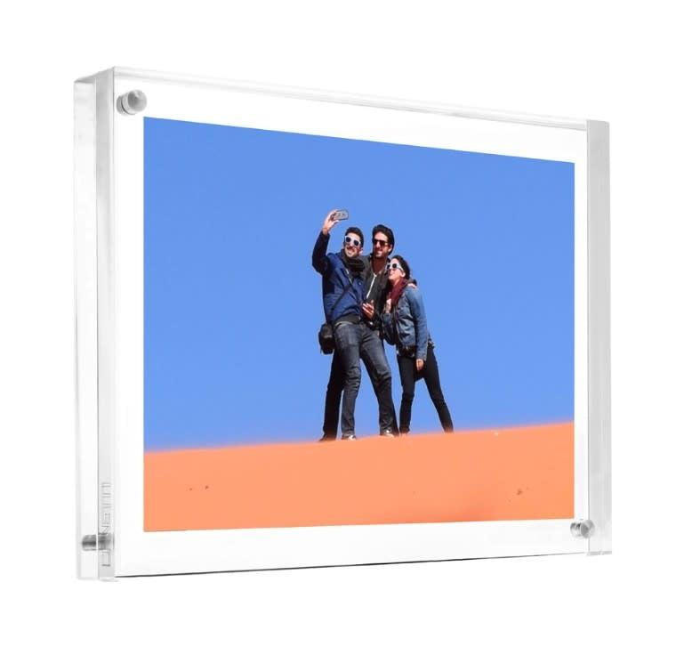Horizontal, vertical, or square photos can be placed between the frame's two clear panels, which are fastened together using built-in magnets. The magnets form a secure seal that also allows for a displayed photo to be conveniently changed.