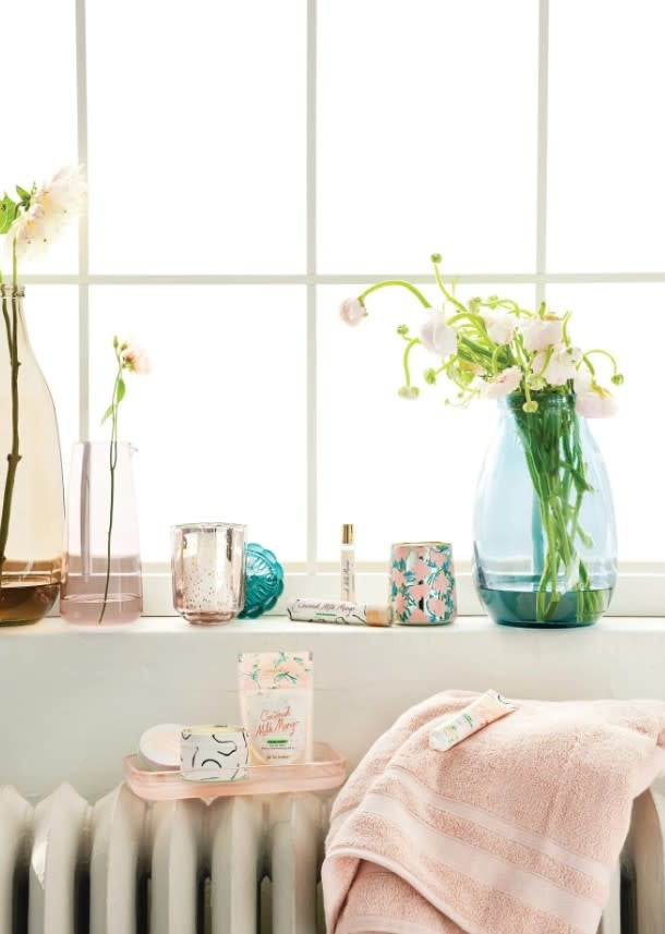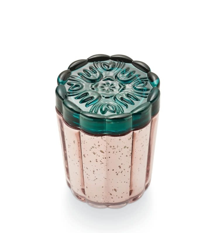 Turn heads with this lightly speckled mercury glass with a pressed glass, floral-shaped lid.