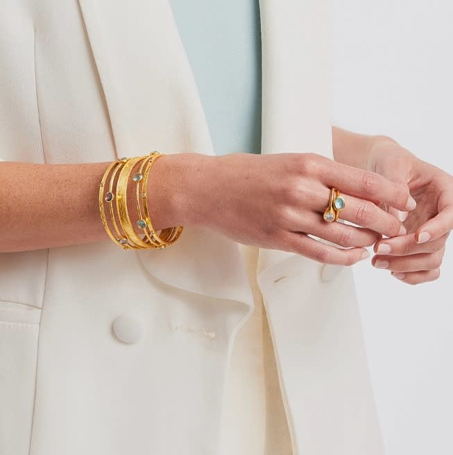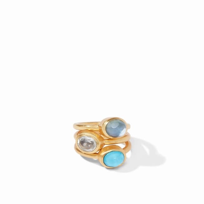 - Model is wearing a stack of 3 rings in Iridescent Slate Blue, Iridescent Pacific Blue and Cubic Zirconia
