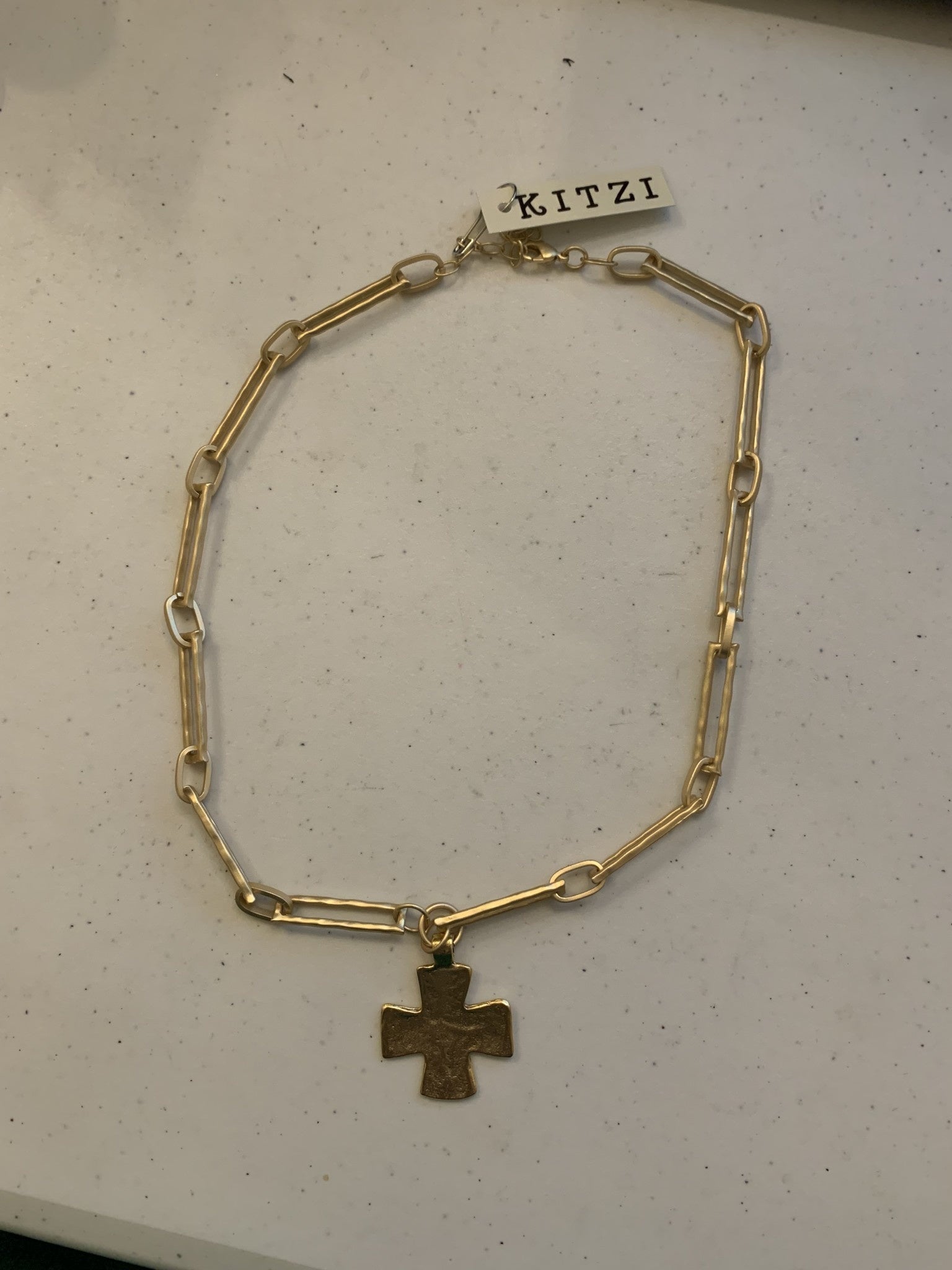 Kitzi Square Gold Cross on Textured Gold Chain Link Necklace