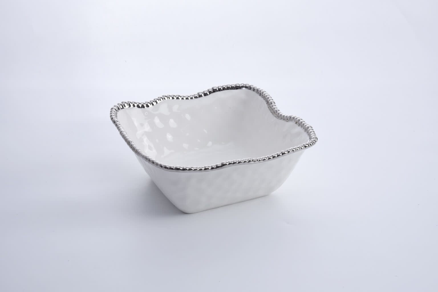Gleaming white porcelain with lustrous silver beads in titanium. Food safe. Dishwasher safe. Oven safe to 500°. Easy Care.