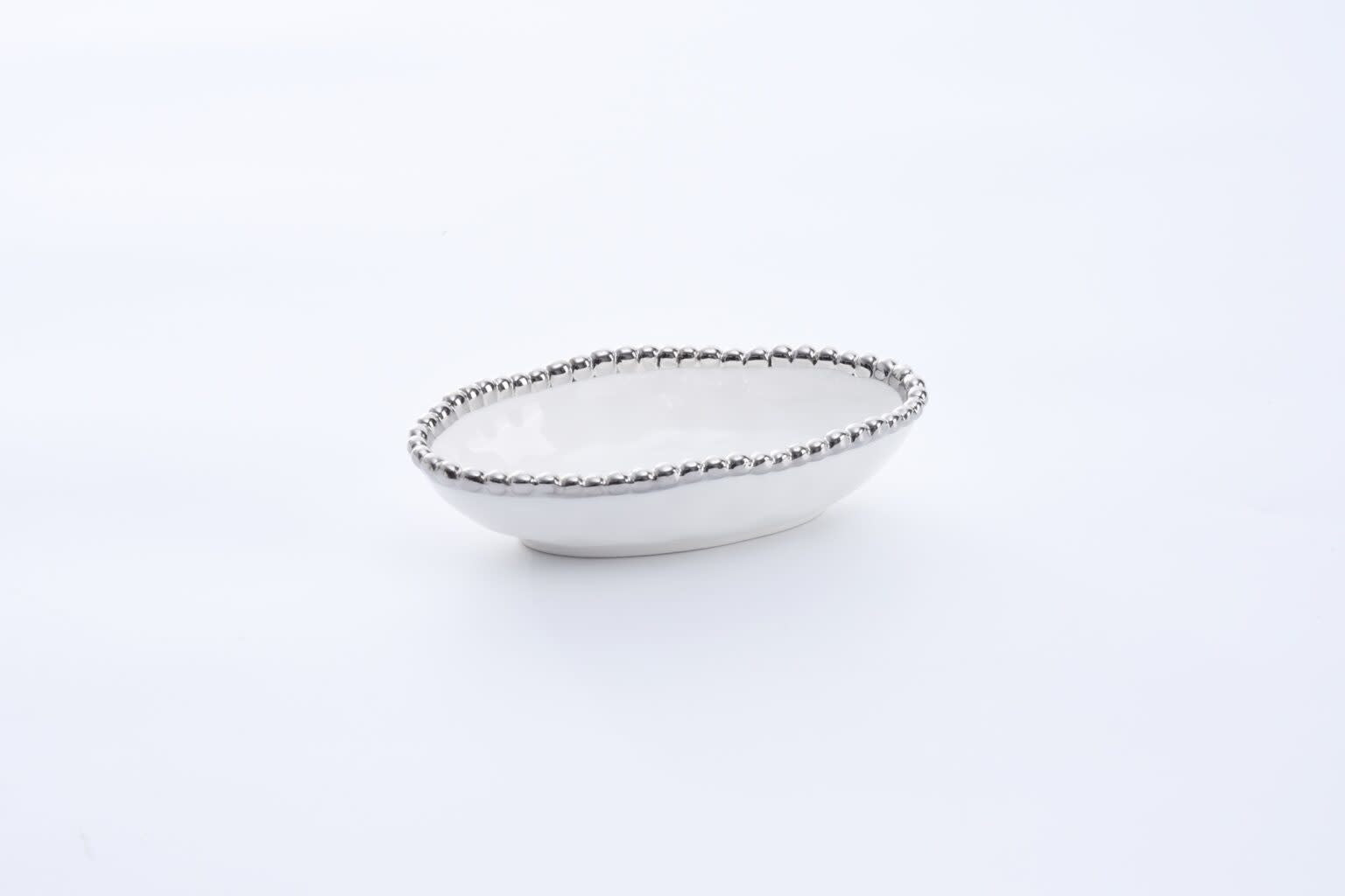 Gleaming white high-fired porcelain with titanium finished silver beading. Food safe, dishwasher safe, oven safe to 500°. Easy Care.