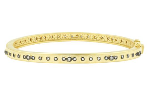 The Mini Stud Bezel Stone Eternity Hinge Bangle was designed especially for stacking! The oval hinge is always a favorite when stacking! The mixed metal combination with subtle stone details make this bracelet a perfect subtle statement for any wrist!