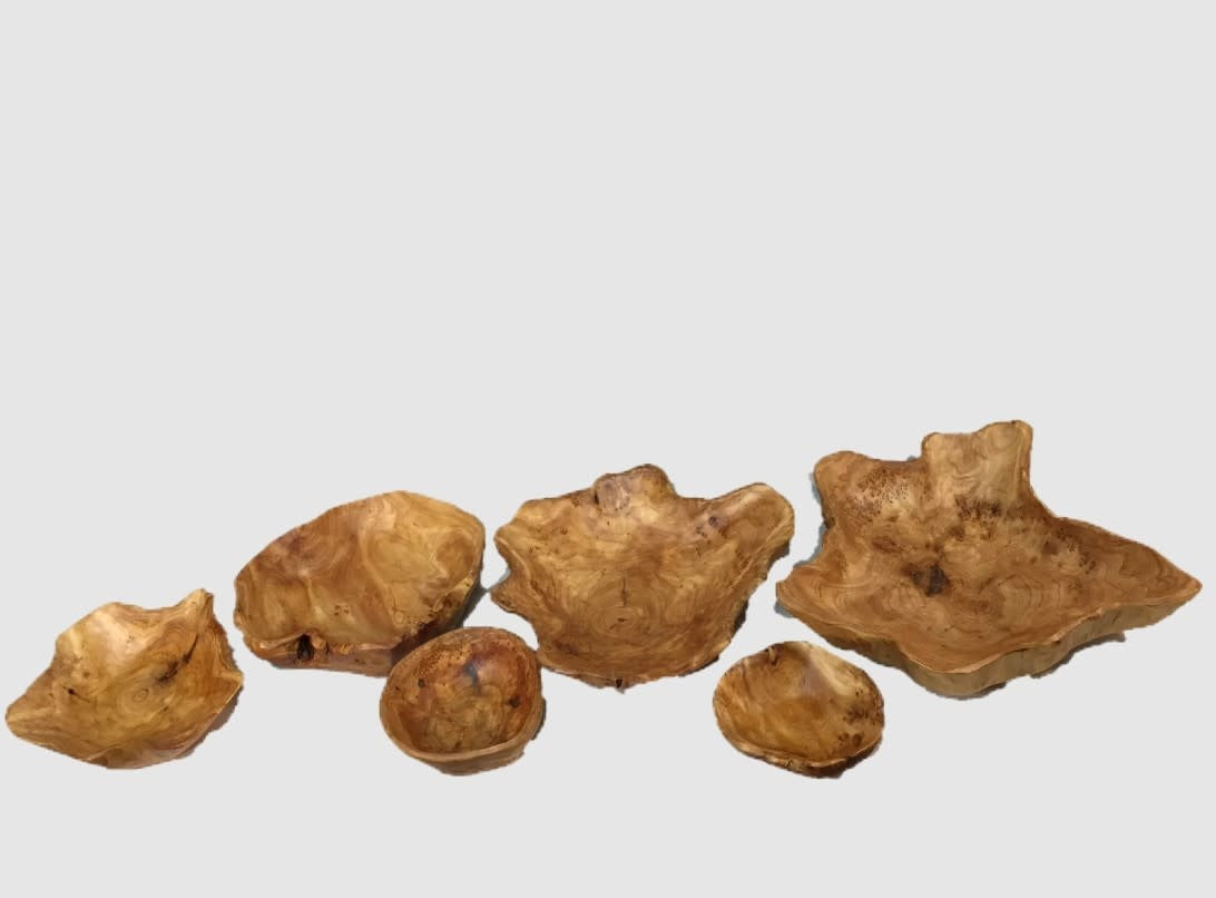 Handcrafted from the roots and stumps of the asian cypress known as shan mu. These beautiful bowls serve for everything from storing keys and nuts, in the smaller sizes, to stunning presentation pieces for salad, fruit, or bread in our larger sizes. Each piece is absolutely unique. As each bowl is food safe all you need to do for clean up is wash it with soap and water.