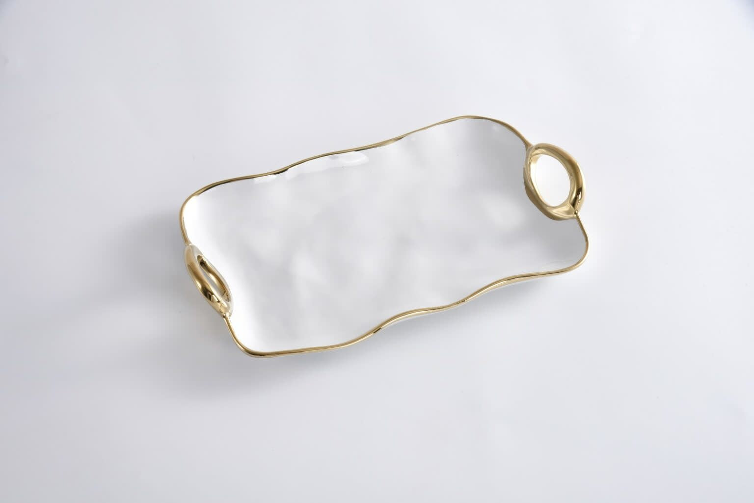 Stunning white porcelain with smooth and fluent handles in gold titanium. Food safe, dishwasher safe, oven safe to 500°. Easy Care.