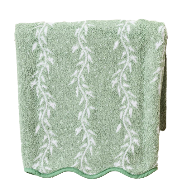 Weezie Towels Luxury Patterned Scallop Edge Bath Towel | Willow Leaves + Green Piping